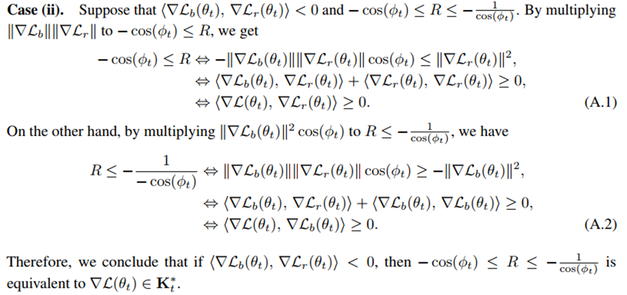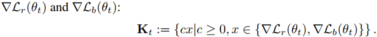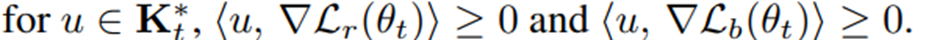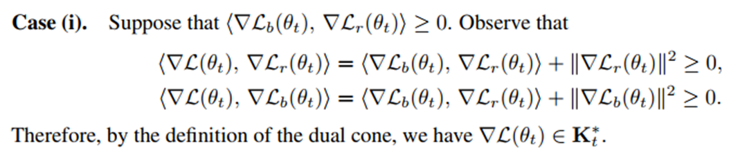 결국 맨 아래 \(⟨\nabla \mathcal{L}, ∇\mathcal{L}_r(\theta_t)⟩ ≥ 0, ⟨\nabla \mathcal{L}, ∇\mathcal{L}_b(\theta_t)⟩ ≥ 0\) 로 전개된다는 것을 보면 됨.
