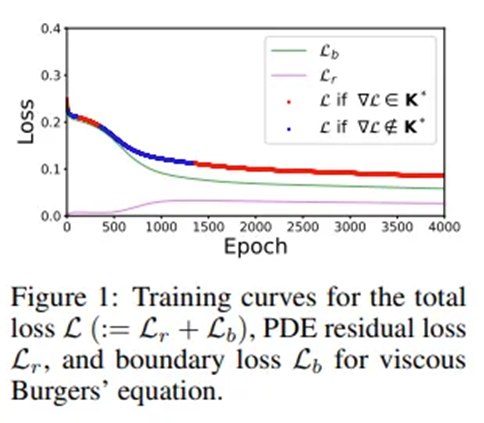 Boundary condition loss와 PDE residual loss의 기울기 크기 불균형과 음의 내적(gradient conflict)이 학습 실패의 주요 원인임을 지적