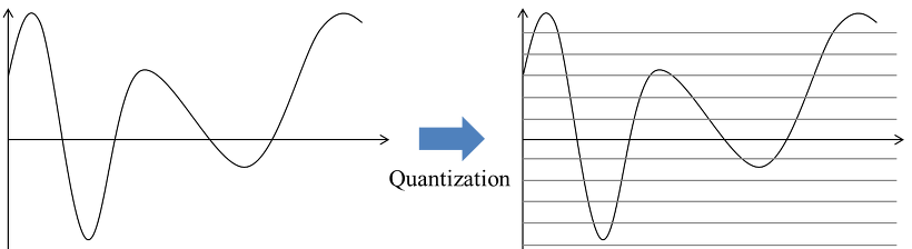 양자화(quantization): 샘플링에 의해 생성된 각각의 수를 유한 개의 이산 진폭 레벨 가운데 가장 가까운 레벨로 표현. 예를 들어 16비트 이진수로 나타내면, 각 샘플을 216개의 레벨로 표현할 수 있다. 메시지 신호가 샘플링과 양자화 과정을 모두 거치면, 시간축과 진폭출 모두 이산적으로 표현된다.