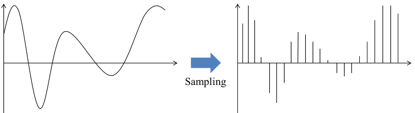 샘플링(sampling): 메시지 신호를 특정 순간에서 그 진폭을 나타내는 일련의 수로 변환