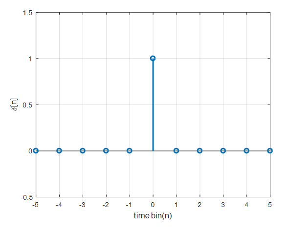 \(\delta[n]= \begin{cases} 1,\quad n=0\\ 0,\quad otherwise \end{cases}\)