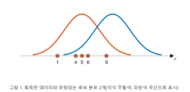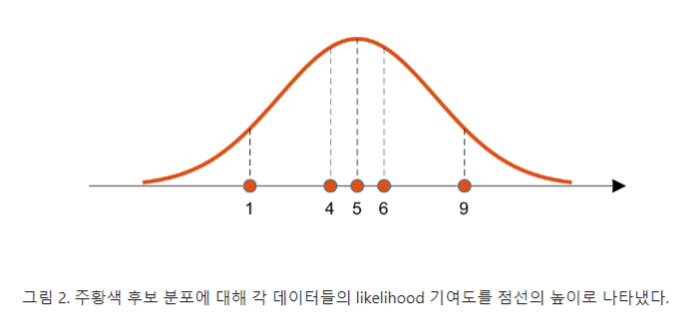 눈으로 보기에도 파란색 곡선 보다는 주황색 곡선에서 이 데이터들을 얻었을 가능성이 더 커보인다. 왜냐면 획득한 데이터들의 분포가 주황색 곡선의 중심에 더 일치하는 것 처럼 보이기 때문이다.