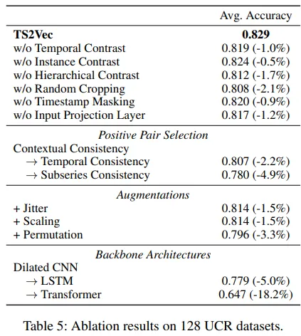 TS2Vec은 다양한 구성 요소의 조합으로 이루어져 있으며, 그 각각이 표현의 품질에 영향을 미친다.